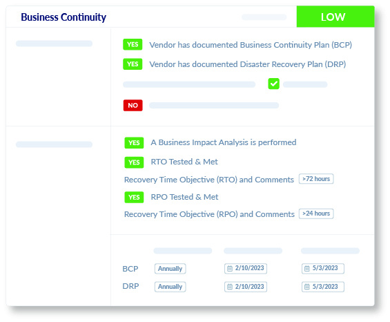 We determine your vendor or supplier's capacity to provide services during unexpected business disruptions, and their ability to resume normal operations, including Recovery Time Objective and Recovery Point Objective. We also verify that they have documented business continuity and disaster recovery plans in place.
