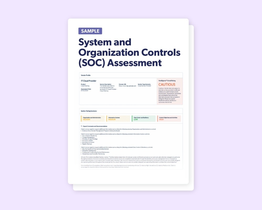 Our SOC Assessment provides an in-depth analysis of your vendor's SOC reports, assisting you in ensuring their control environment is secure and compliant. This assessment allows you to easily understand your vendor's controls, helping protect your sensitive data and maintain regulatory compliance.