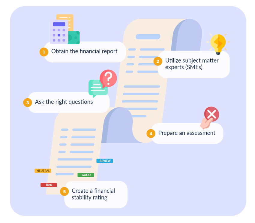 - Utilize SMEs: Vendor financial documents can be tricky to review without the right qualifications. Subject matter experts (SMEs) like CPAs should review the vendor's financial reports to ensure you’re getting a qualified opinion on the vendor’s financial stability.