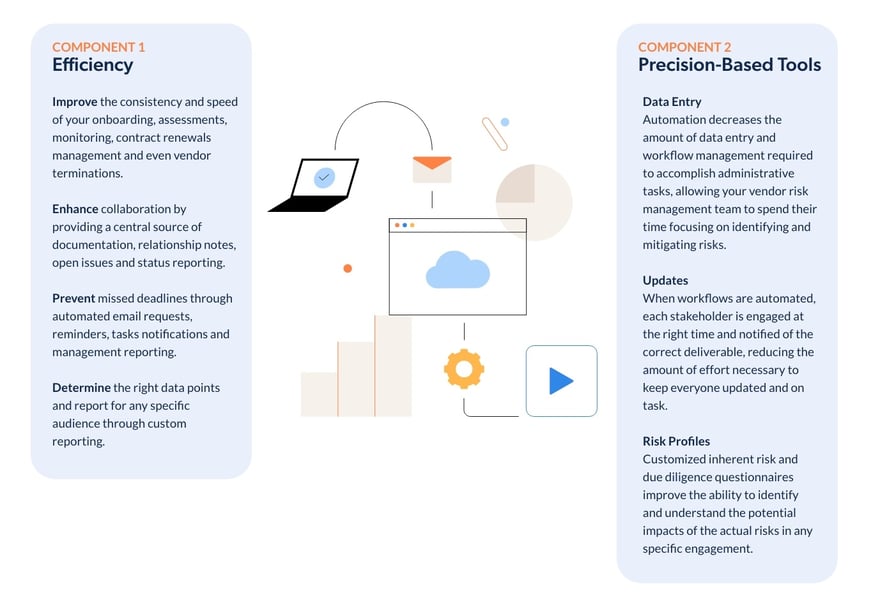 Automating manual processes and tasks through a vendor risk management system can provide many benefits, but it’s important to choose the right platform. Let’s identify two important components that should be included in your platform and how these features can benefit your overall vendor risk management program.