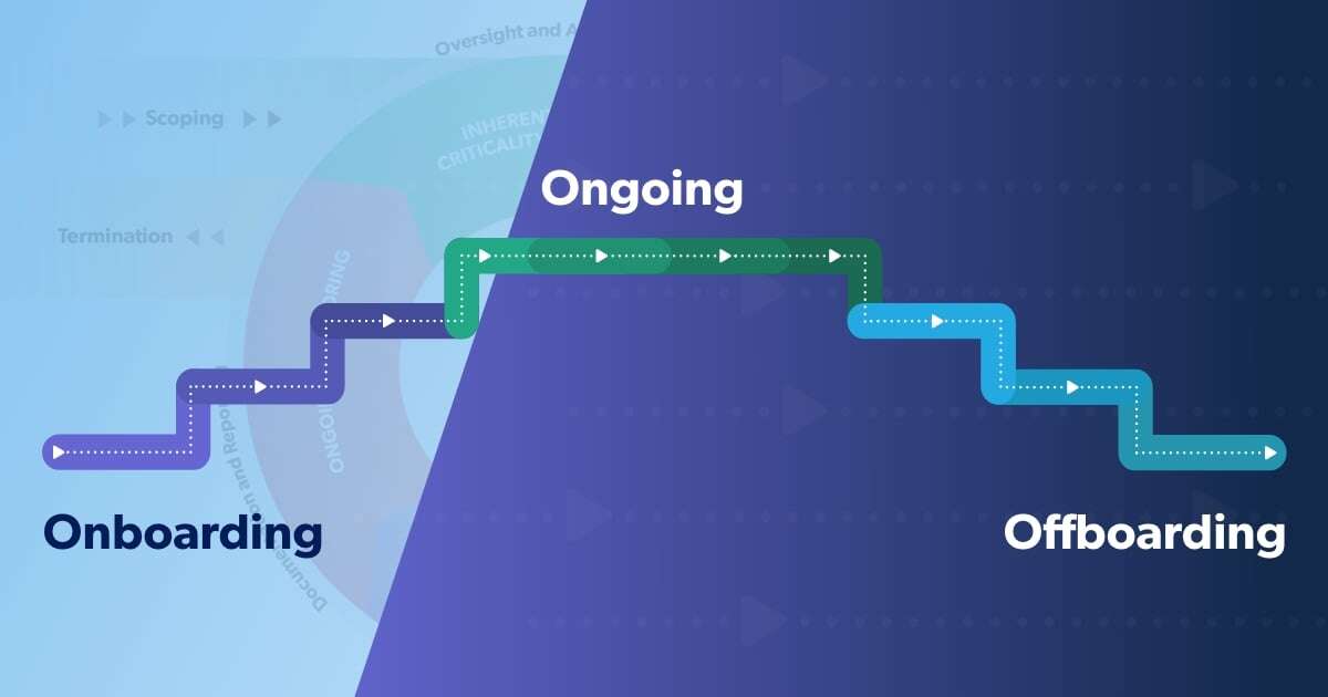 - Offboarding: Vendor relationships do come to an end eventually. It might be because the work has been completed, your organization's needs have changed or the vendor's performance hasn’t met expectations. Whatever the reason, your organization needs a standardized process to safely and soundly exit the relationship and tie up any loose ends.