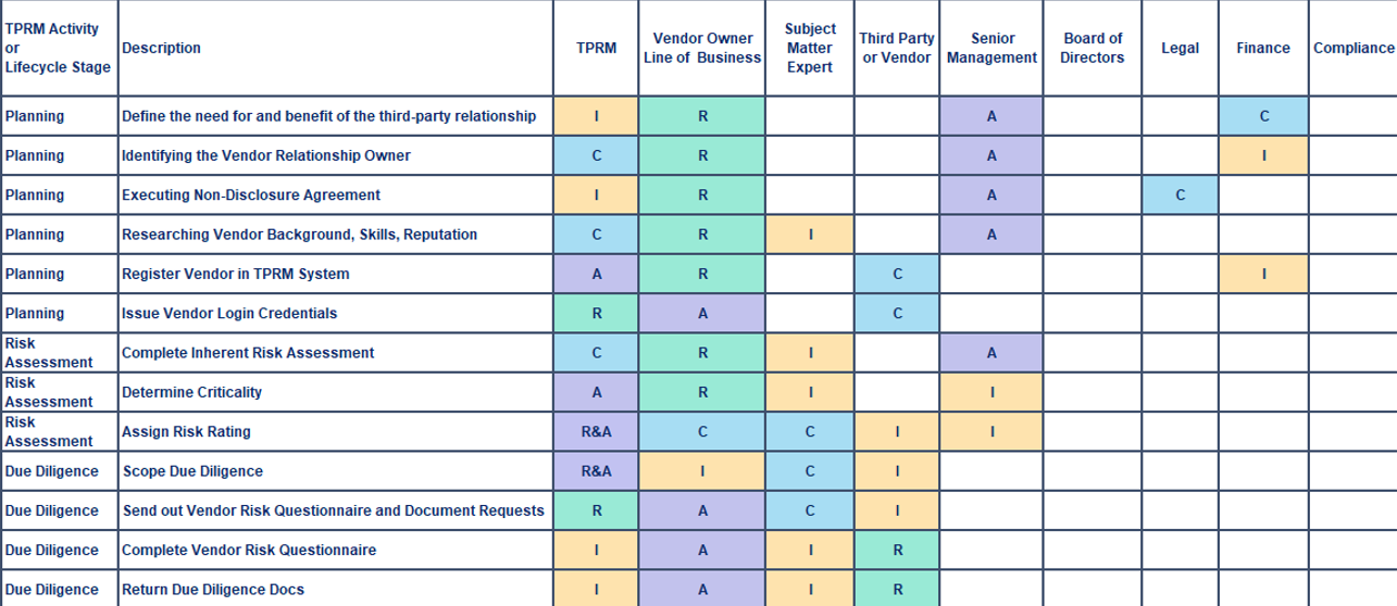- Create a RACI matrix – A visual matrix is a great way to represent the roles and responsibilities for each task. Color code each RACI value and list a description of the task or process. As you can see below, for the activity “Assign Risk Rating,” the TPRM team is both Responsible and Accountable, the Vendor Owner is Consulted, the Subject Matter Expert is Consulted, the Vendor is Informed, and Senior Management is Informed.