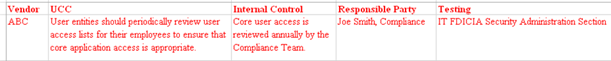 Answer: “To appropriately verify your organization addresses service organization control considerations, key internal controls should be documented by management. In addition, it’s key to note an individual responsible for that portion of the review, and also how that key internal control is tested. Here is an example:
