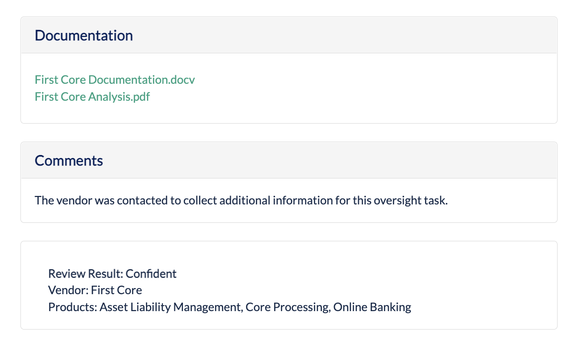 You’ll see the documentation that was used for the review, who completed the review, the result of the review, and any other commentary.