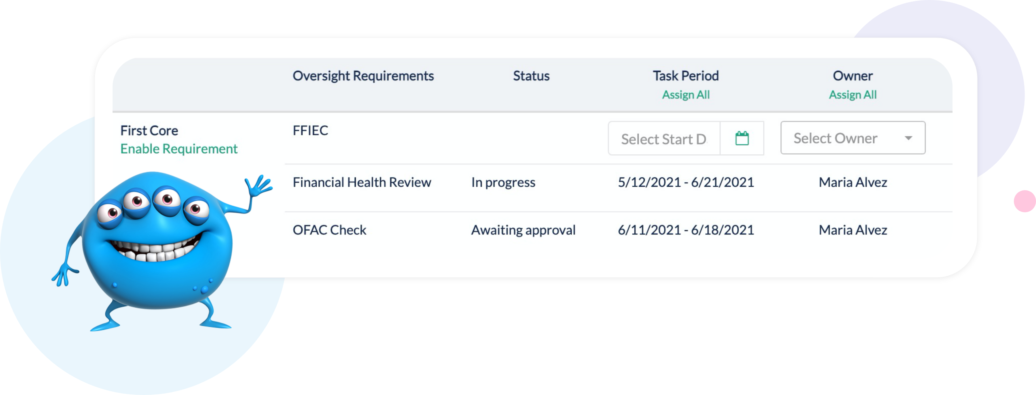 Easily set up the required tasks for your oversight management and assign them to the relevant users to create accountability across your organization.