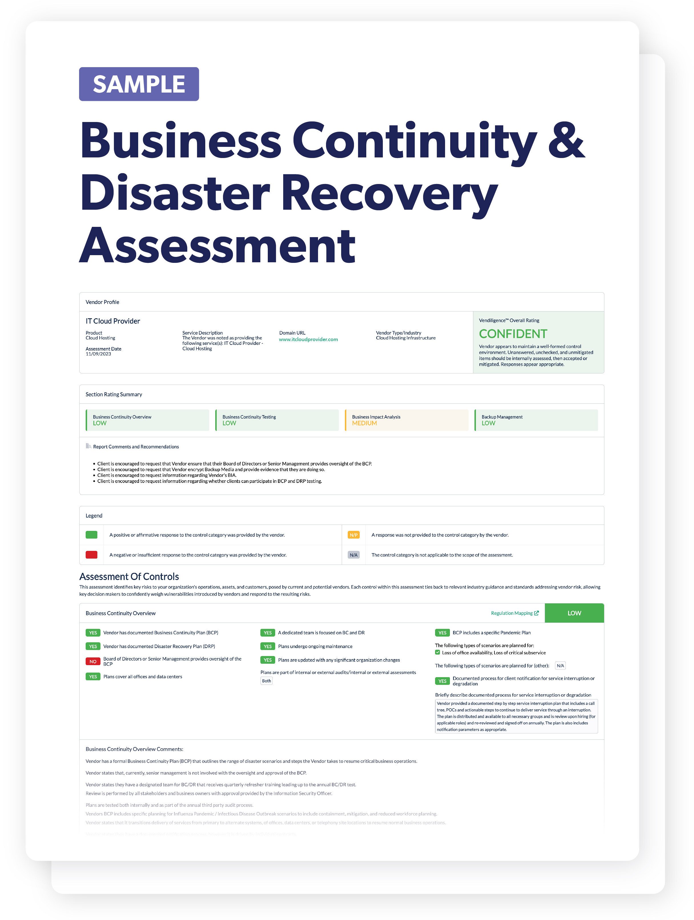 Get a sample copy of this business continuity risk assessment to see how Venminder can reduce your work and help you identify potential gaps at your vendor before they disrupt your business or your customers.