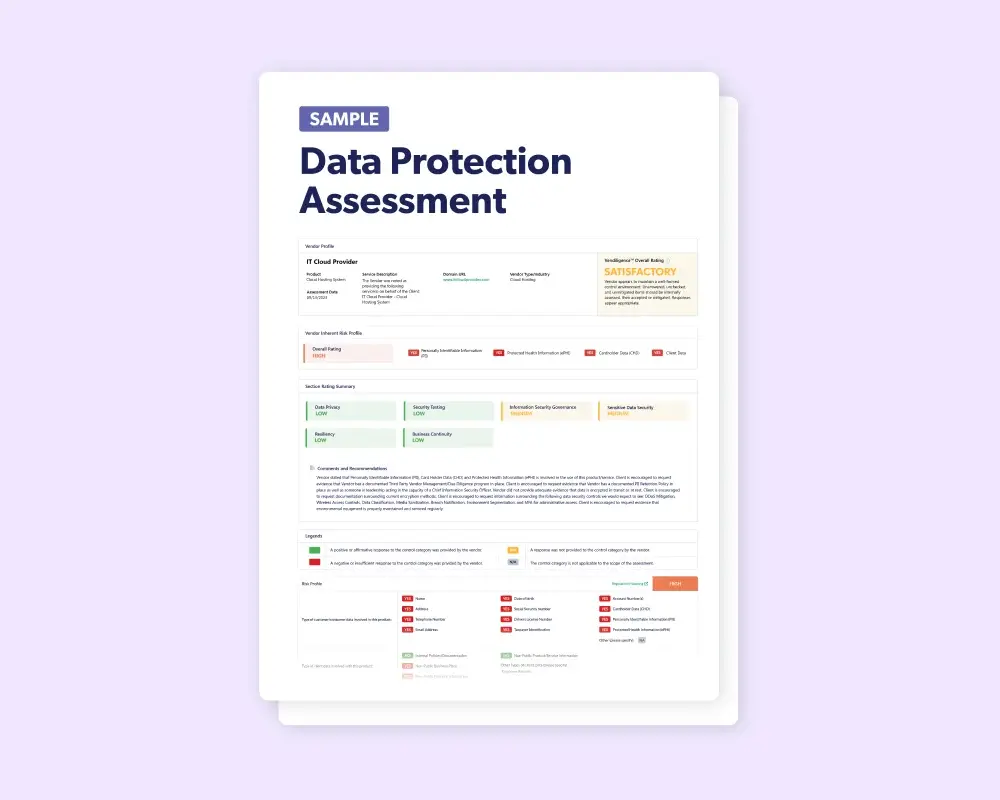 Get a sample copy of this data protection risk-based assessment to see how Venminder can help you identify areas of possible weakness in your vendor or supplier's data protection practices.