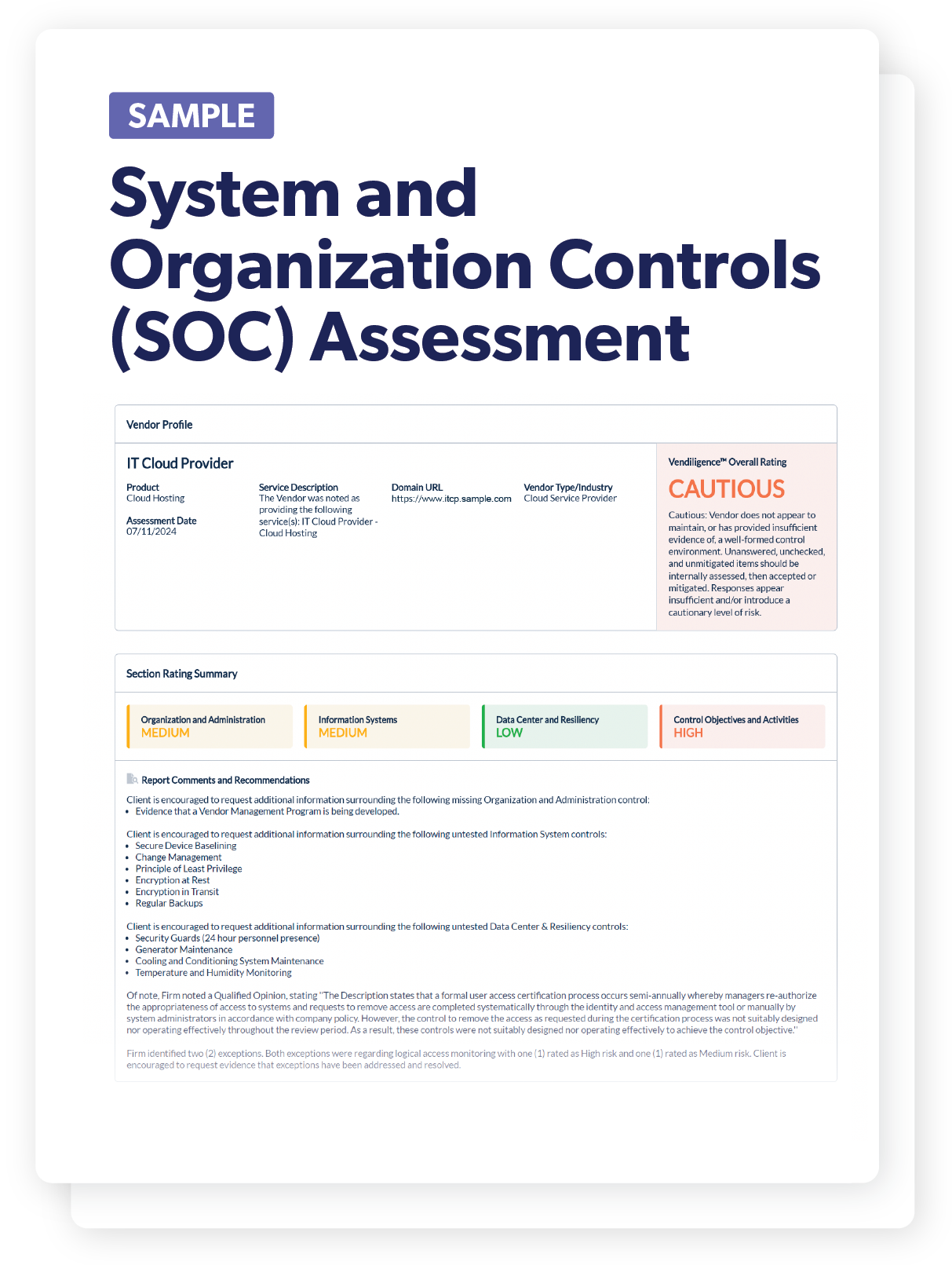 Our assessment helps you focus on the effectiveness of specific control activities by reviewing exceptions found in SOC reports and assessing overall impact and providing a detailed and easy to digest summary of any issues found.